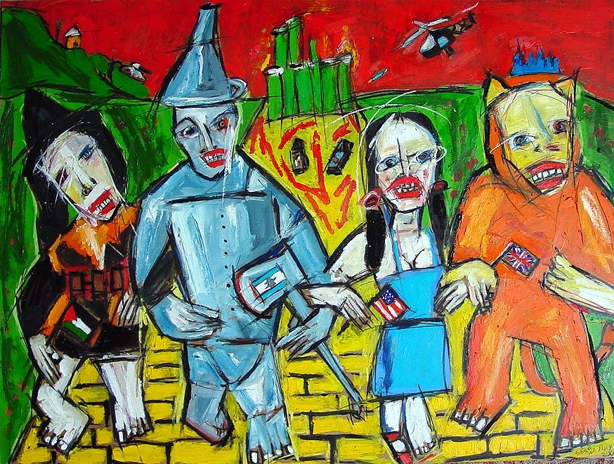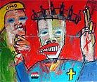 "More Lies (with Iraqi children in bush skirts)" 30" x 40" mixed on chipboard "31 Days in July" 2003 project (July 10) *SOLD |