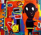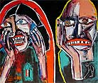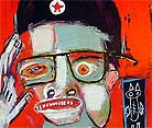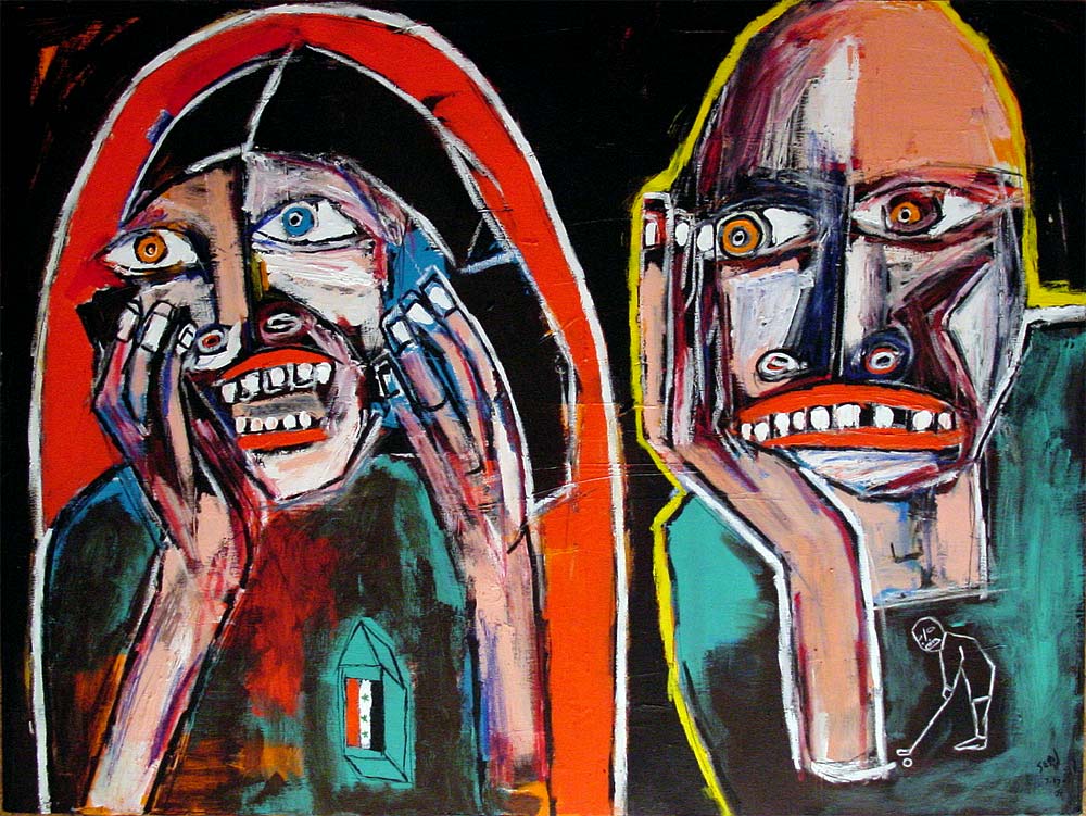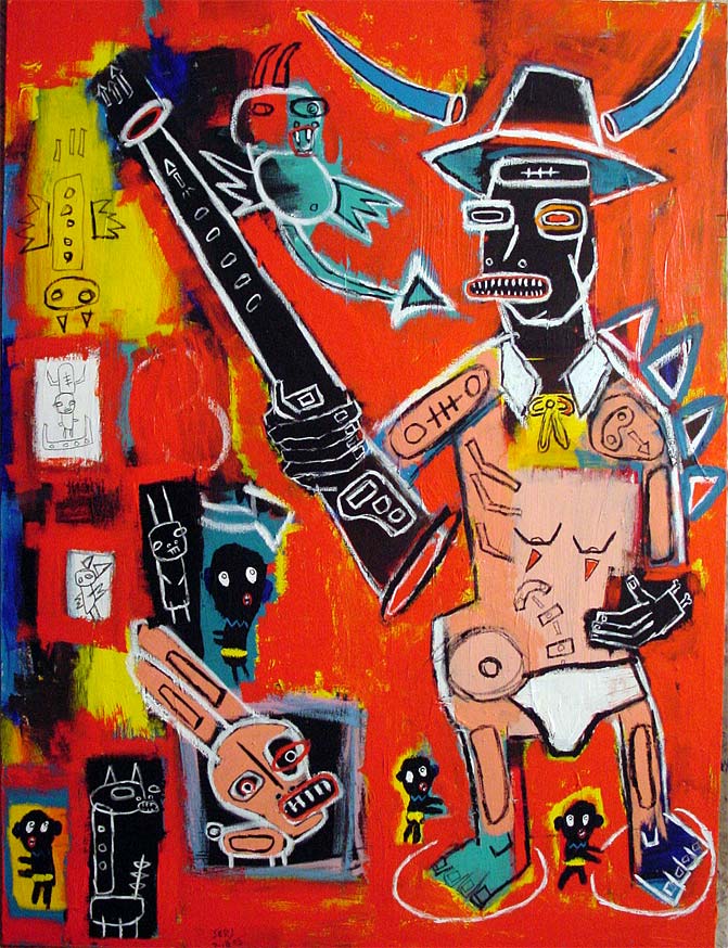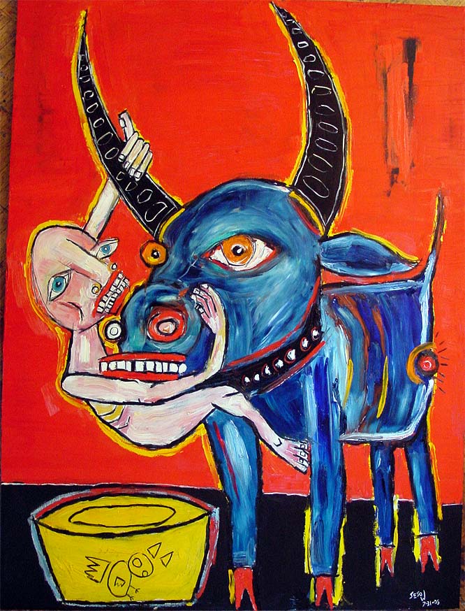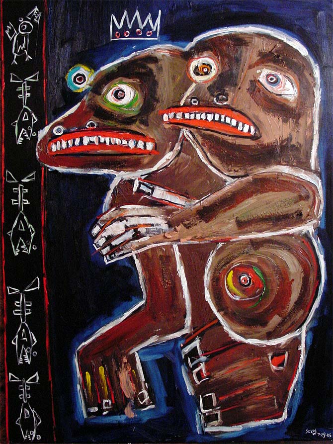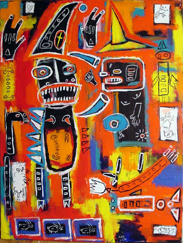 "Caged Beastie" (story:sadaam to be charged on 1982 masacare) 30" x 40" acrylic on stretched canvas "31 Days in July Series" (July 18) *SOLD link to 2004 ... link to 2003 |
