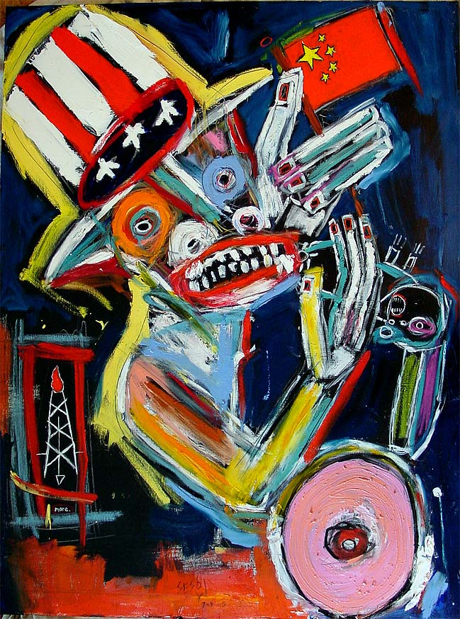 "Land of Greed, World in Need" (story:china tells congress to back off businesses) 30" x 40" oil on stretched canvas "31 Days in July Series" (July 5) *SOLD link to 2004 ... link to 2003 |