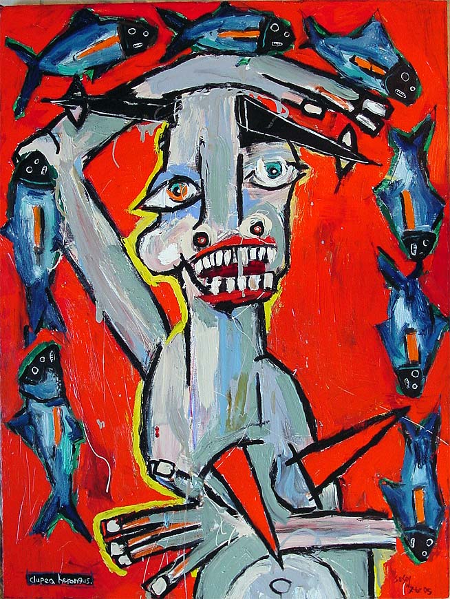 "Happy Herring (clupea herangus)" (story:doubts on vitamin e) 30" x 40" oil on stretched canvas "31 Days in July Series" (July 6) *SOLD link to 2004 ... link to 2003 |