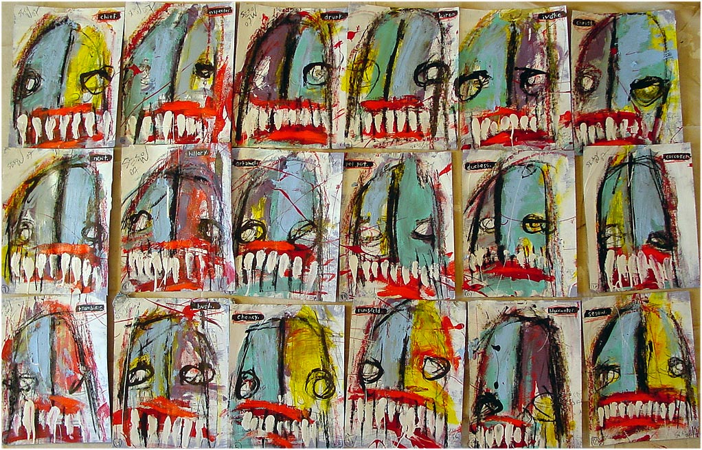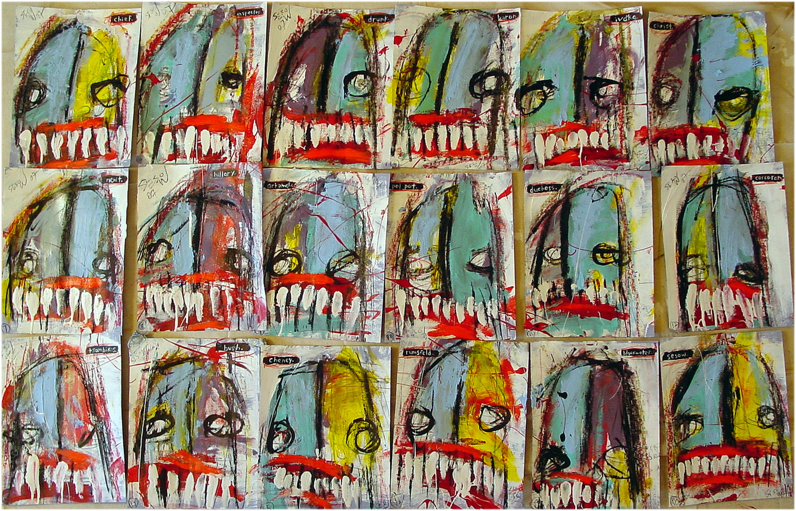 "the Conspirators" eighteen 8.5"x11" durable pieces of purple paper oil/acrylic on purple paper for DETAIL CLICK HERE |