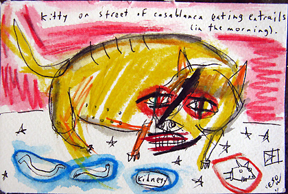 "kitty on street of casablanca eating entrails (in the morning )" mix on watercolor paper 4" x 6" created in Casablanca, Morocco (April 2011) $35 email sesow@sesow.com to reserve/ask about purchasing. please include url and description. |