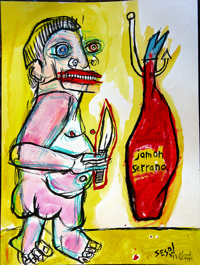 "Large Naked Man with jamon serrana" mix on paper 9" x 12" created in Barcelona, Spain (April 2011) $60 email sesow@sesow.com to reserve/ask about purchasing. please include url and description. |