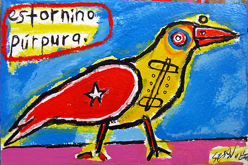 "estornino purpura" mix on watercolor paper 4" x 6" created in Barcelona, Spain (April 2011) *SOLD email sesow@sesow.com to reserve/ask about purchasing. please include url and description. |