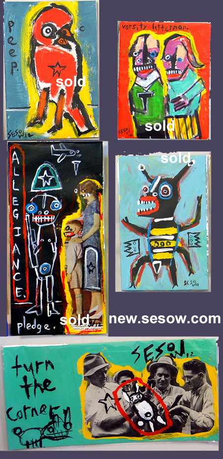 Available Small Paintings (March 2013) acrylic/mix on wc paper or matboard approx. 4" x 7", sizes vary *SOLD email sesow@sesow.com to reserve/ask about purchasing. please include url and description. |