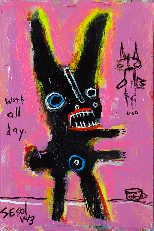"work all day" acrylic/mix on matboard approx 8" x 12" *SOLD email sesow@sesow.com to reserve/ask about purchasing. please include url and description. |