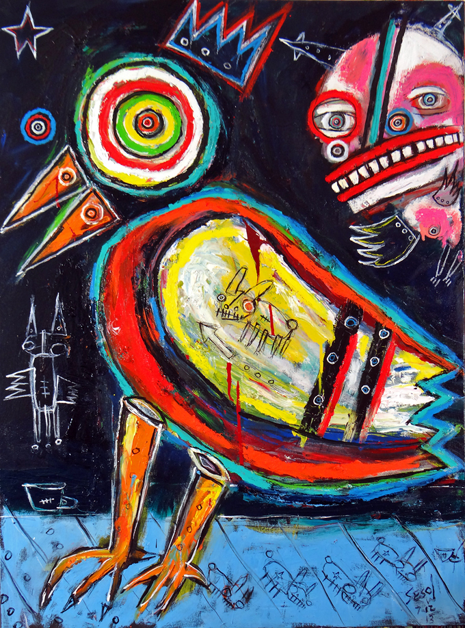 "Riding a Chicken (with pigtails)" acrylic/oil on unstretched canvas approx. 42" x 32" *SOLD email sesow@sesow.com to reserve/ask about purchasing. please include url and description. |