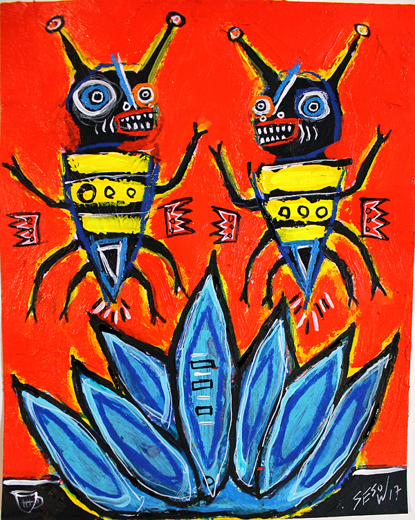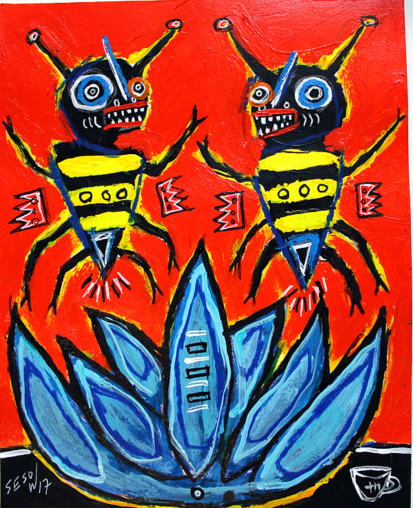 "Two Bees with Blue Agave" acrylic on archival paper 8" x 10" *SOLD email sesow@sesow.com to reserve/ask about purchasing. please include url and description. |