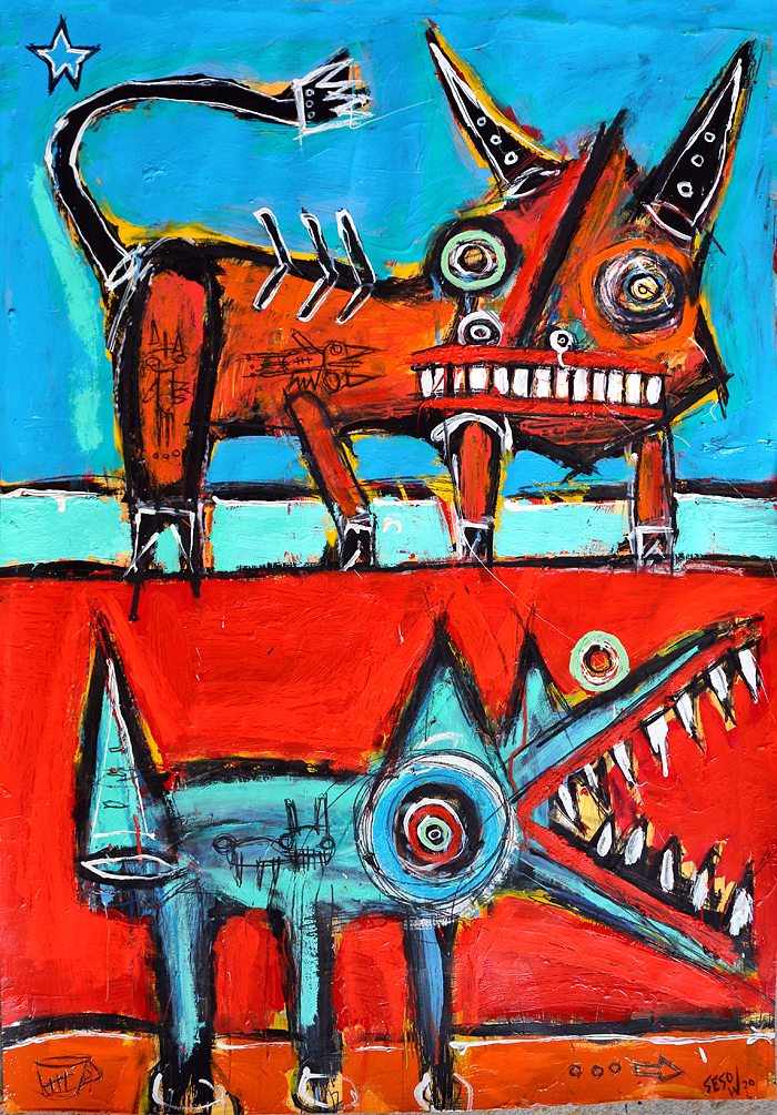 "Bull and Dog" oil/mix on archival paper 28" x 40" *SOLD email sesow@sesow.com to reserve/ask about purchasing. please include url and description. |