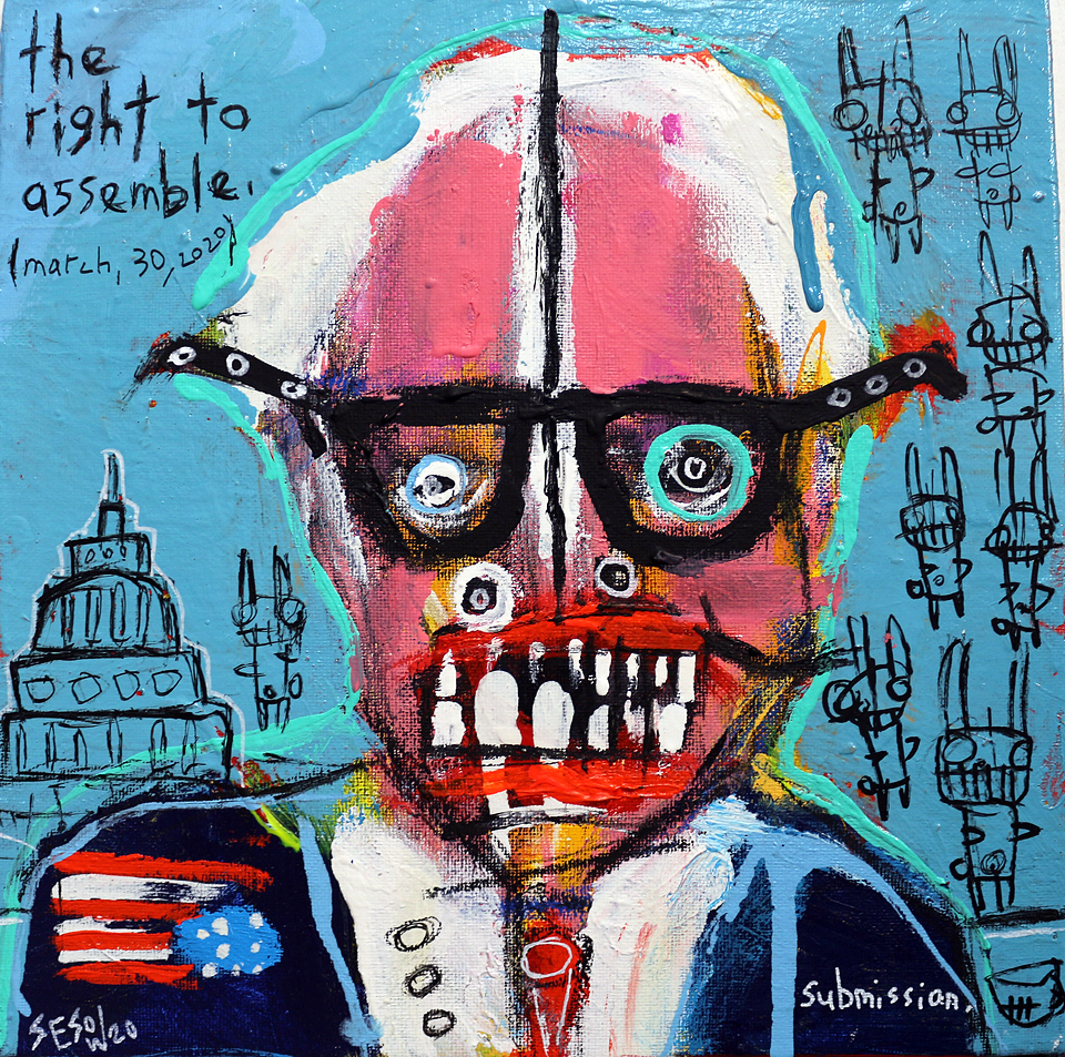 "The Right to Assemble" oil/acrylic on canvasboard 10" x 10" *SOLD email sesow@sesow.com to reserve/ask about purchasing. please include url and description. |