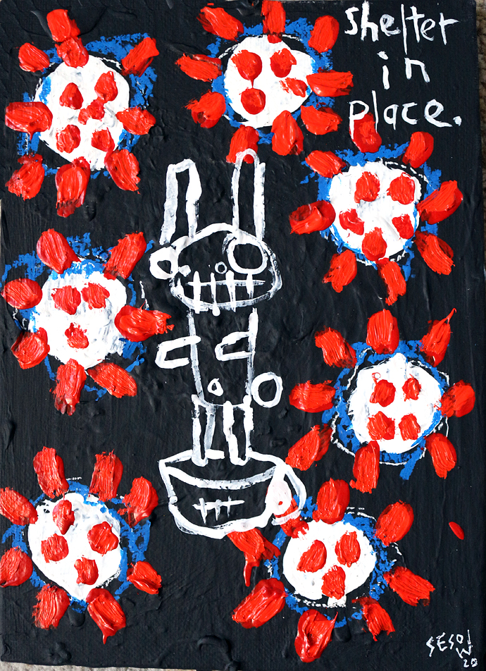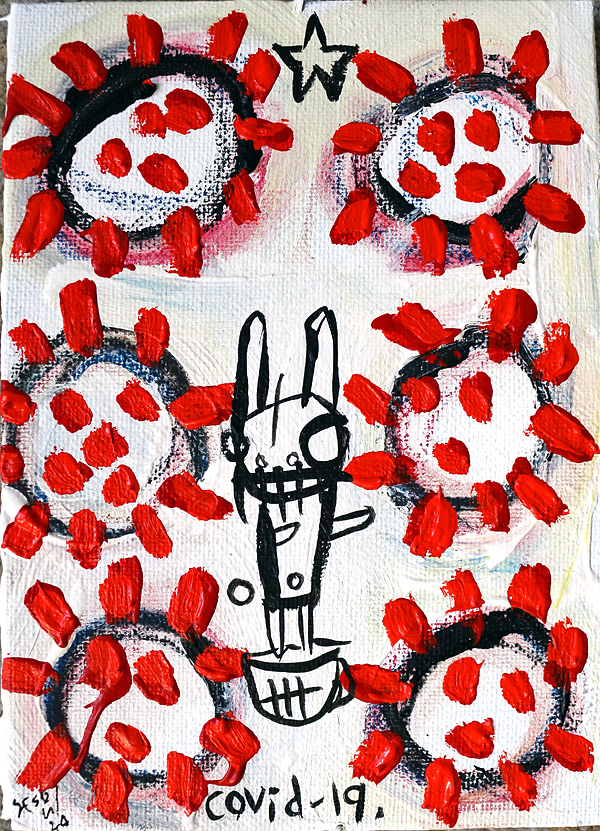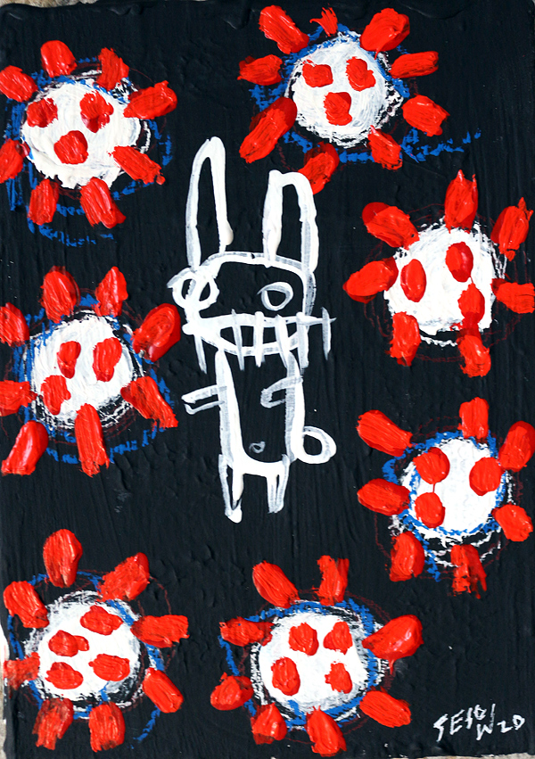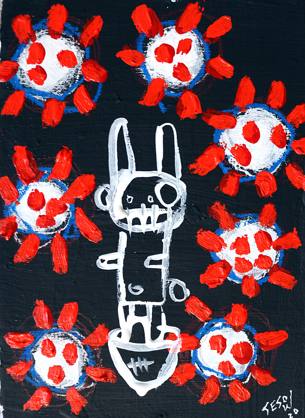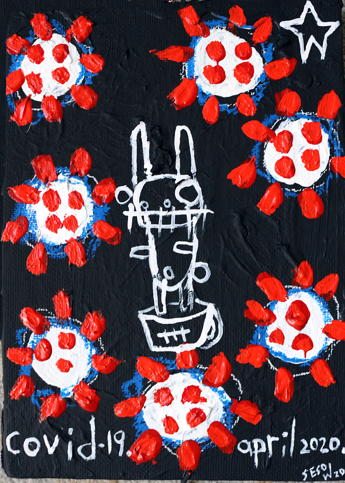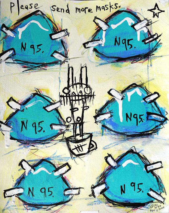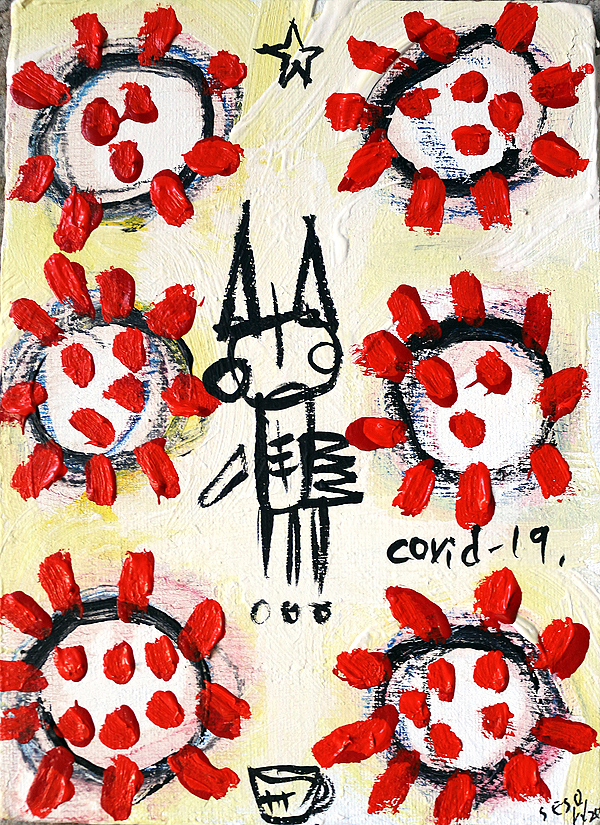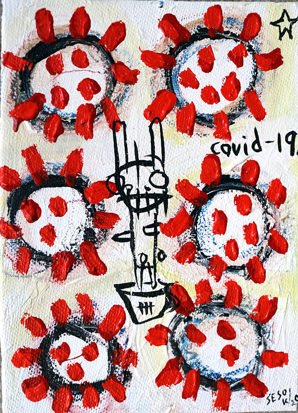 "Covid-19." oil/acrylic on paper 12" x 18" *SOLD email sesow@sesow.com to reserve/ask about purchasing. please include url and description. |