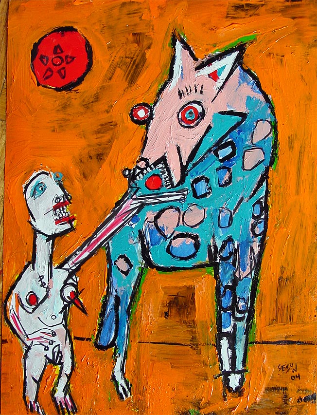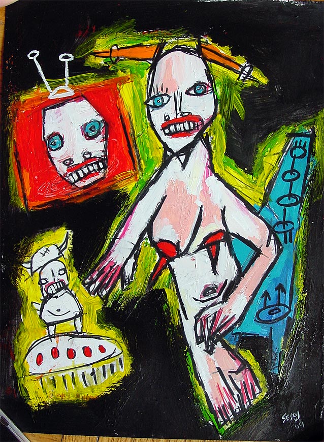 "Antenna and pigtails, with viking (on throwrug)." 9" x 12" acrylic/mixed on bristol paper *SOLD