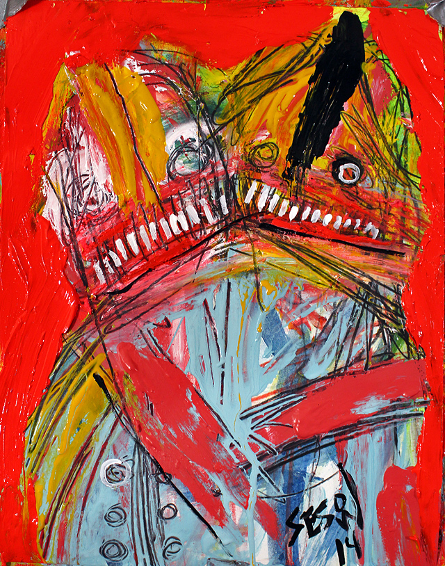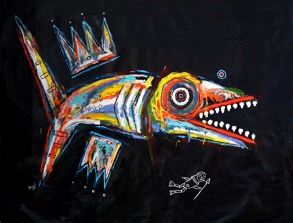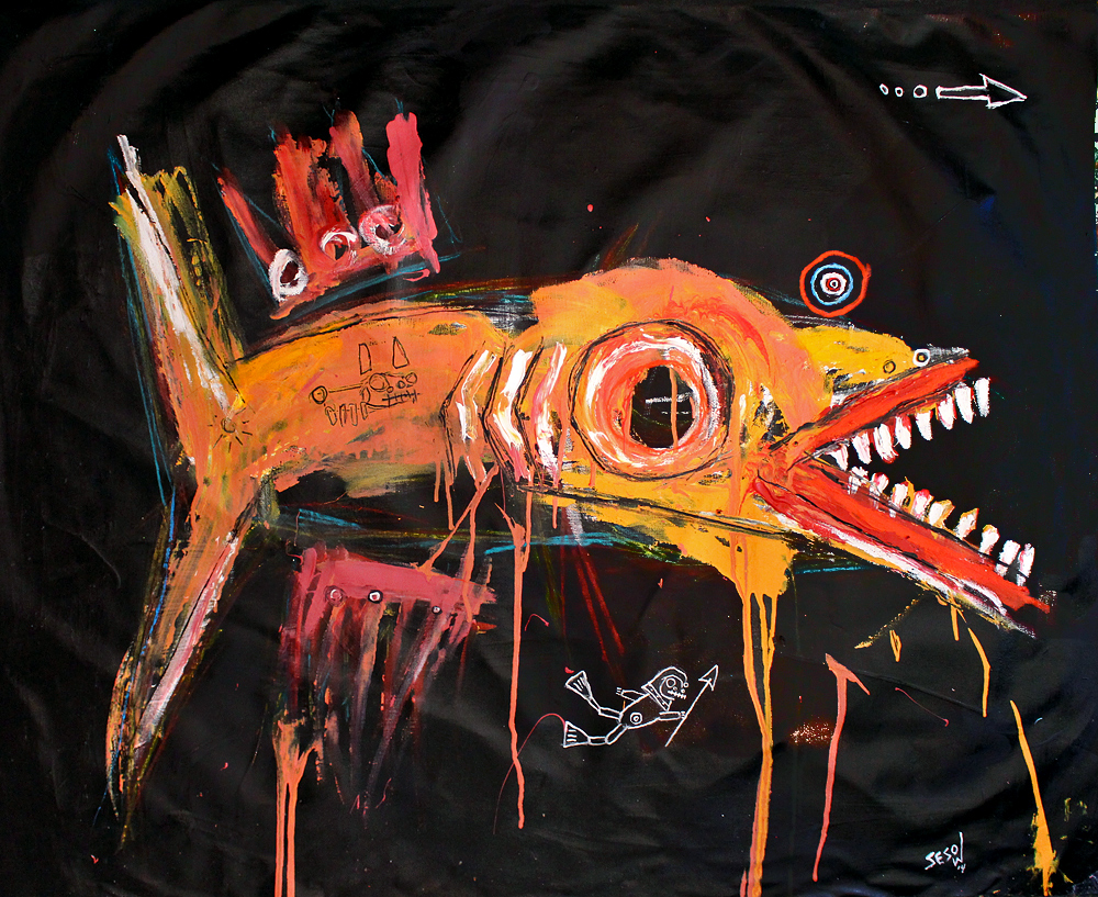 "Large Fish" oil/mix on unstretched canvas approx. 32" x 42" with black border $600 email sesow@sesow.com to reserve/ask about purchasing. please include url and description. |
