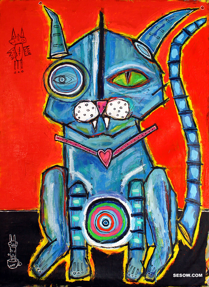 "Good Kitty" acrylic/mix on unstretched canvas 30" x 42" with 2" black border *SOLD email sesow@sesow.com to reserve/ask about purchasing. please include url and description. |