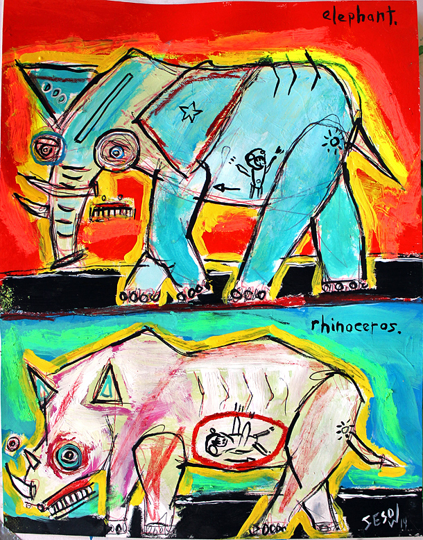 "Elephant and Rhino, with dead poachers" acrylic/mix on papper 11" x 14" *SOLD email sesow@sesow.com to reserve/ask about purchasing. please include url and description. |