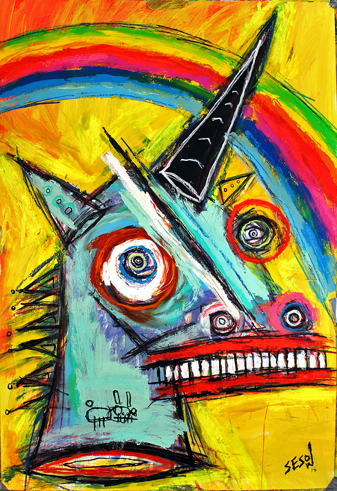 "Rainbow Unicorn" acrylic/mix on watercolor paper 22" x 15" *SOLD email sesow@sesow.com to reserve/ask about purchasing. please include url and description. |