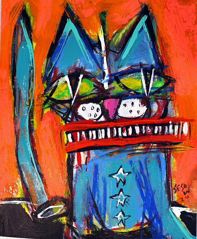 "Three-star Blue Cat" acrylic/mix on archival paper 8" x 10" *SOLD email sesow@sesow.com to reserve/ask about purchasing. please include url and description. |