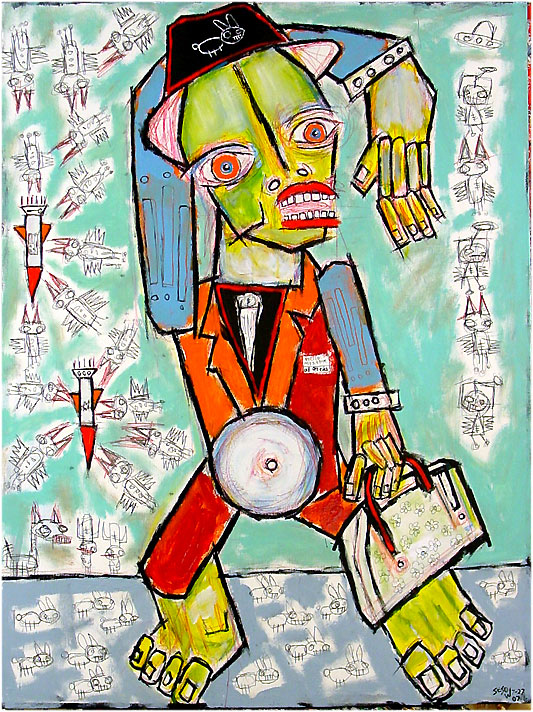 "Confucius (with lucky pachinko hat)" 30" x 40" acrylic/mixed on stretched canvas *SOLD "31 Days in July Series" (July 24, 2007) CLICK HERE to for wash. post cover image |