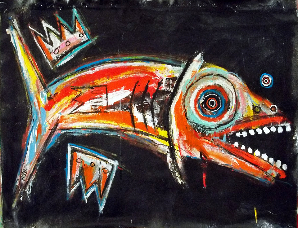 "Fish" $280 (framed in black wooden frame) oil/mix on unstretched canvas approx 18" x 24" |