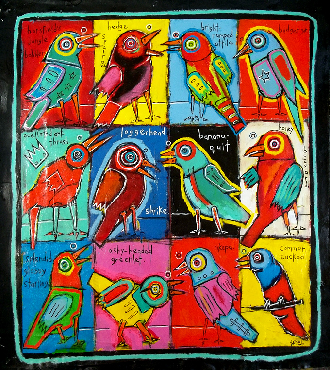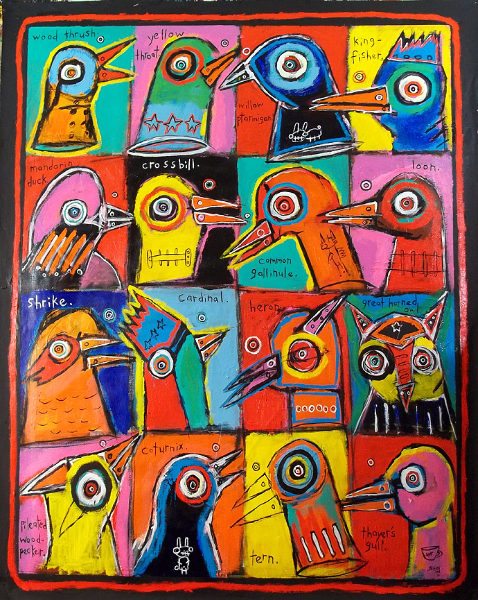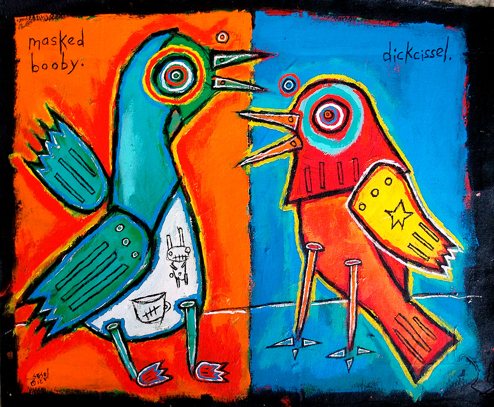"Booby and Dickcissel" this painting is currently represented by the Jeanine Taylor Folk Art Gallery acrylic on unstretched canvas approx. 18" x 24" made in Sanford, Florida |