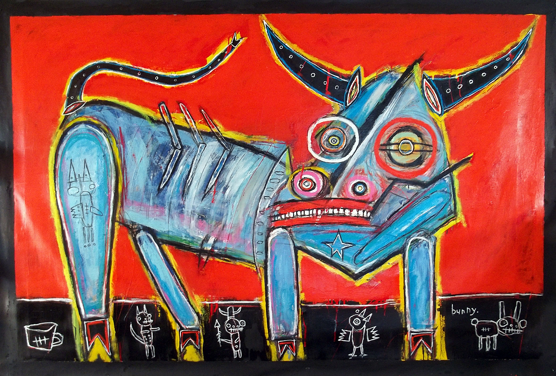 "The Bull, The Bunny" *SOLD oil/mix on unstretched canvas approx 43" x 65" |