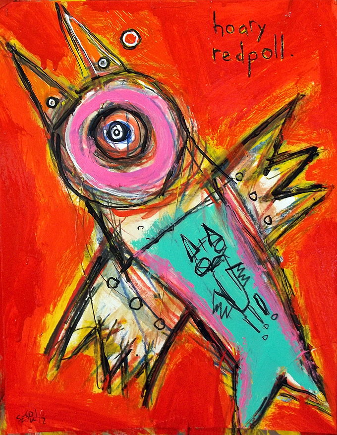 "Hoary Redpoll" this painting is currently represented by the Jeanine Taylor Folk Art Gallery acrylic/mix on archival paper 11" x 14" |