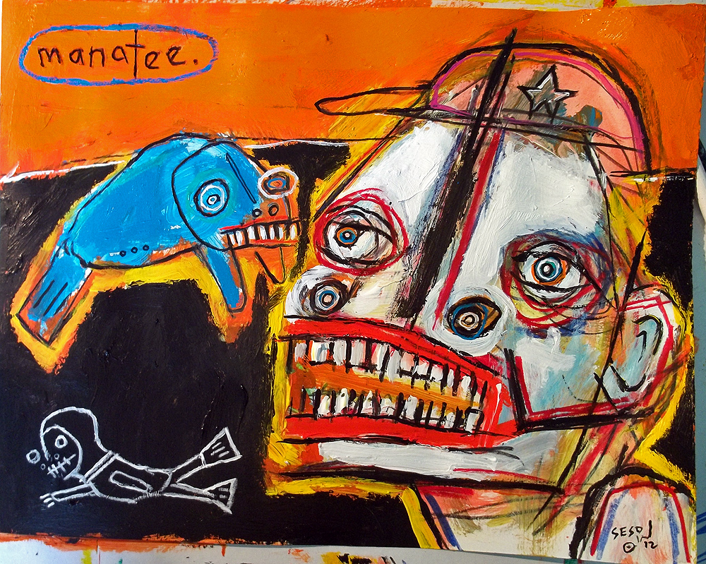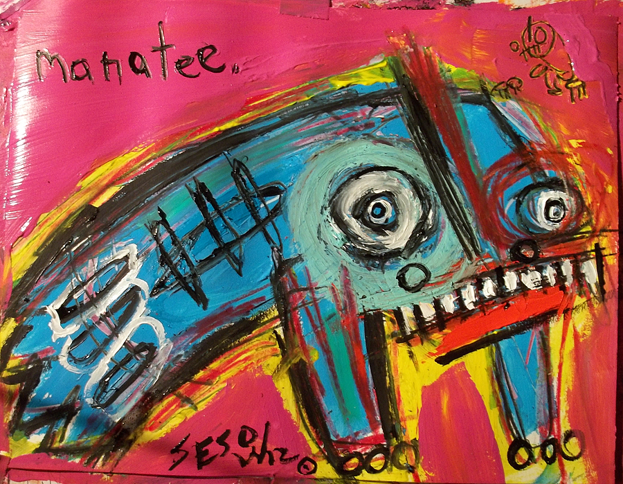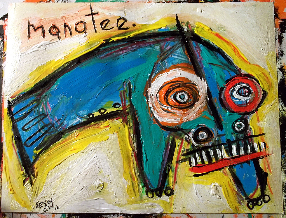 "Drunk Manatee" this painting is currently represented by the Jeanine Taylor Folk Art Gallery acrylic on paper 11"x14" made in Sanford, Florida |