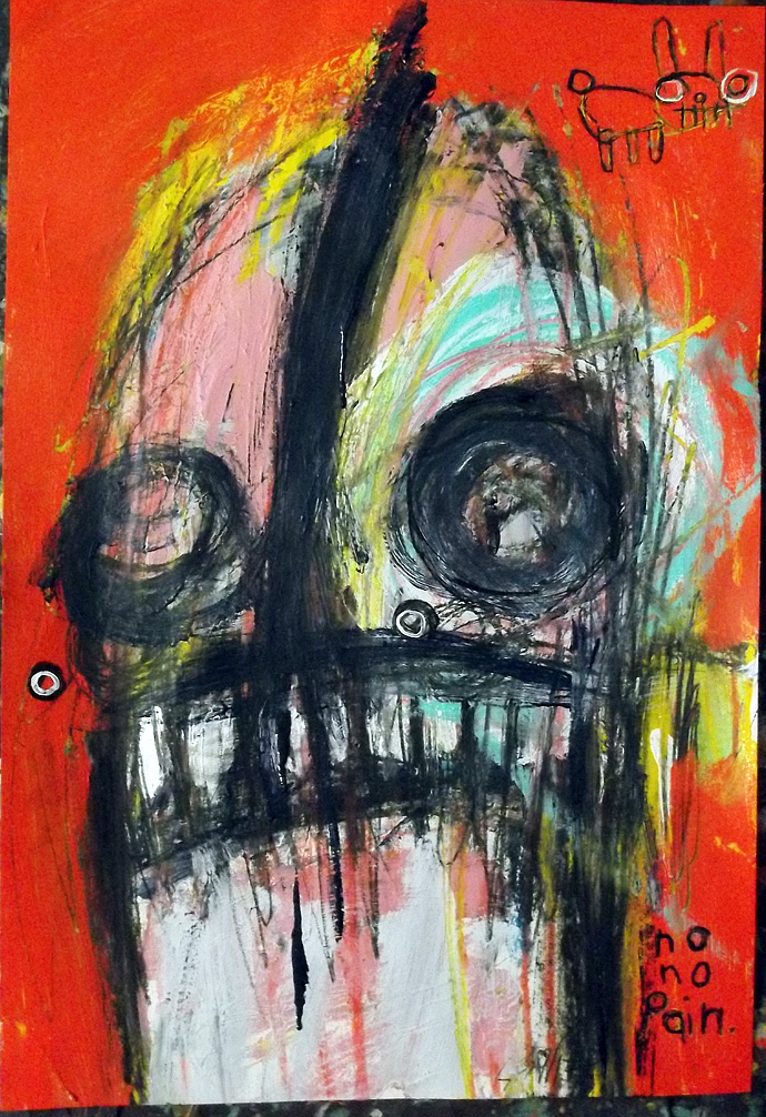 "Pain" this painting is currently represented by the Jeanine Taylor Folk Art Gallery acrylic/mix on archival paper 22" x 15" |