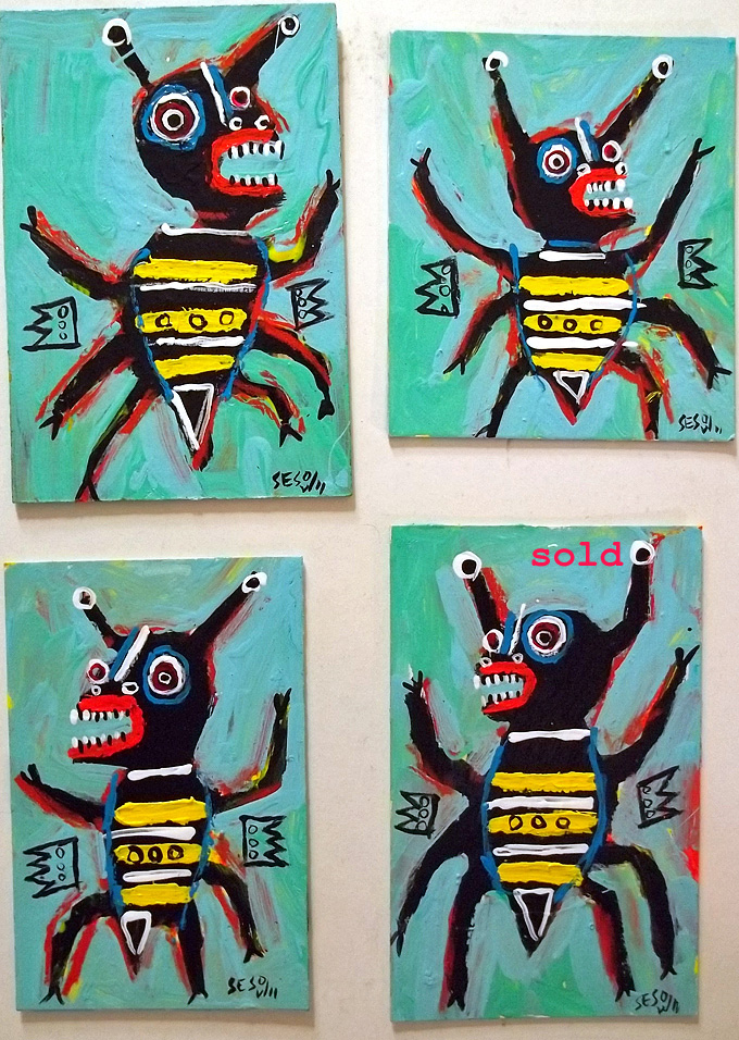 small drones/bees (#2) $40 (free usa shipping) acrylic/mix on matboard approx 4" x 6" email sesow@sesow.com to reserve/ask about purchasing. please include url and description. |
