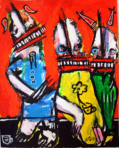"Three is a crowd" acrylic on archival paper 8" x 10" *SOLD email sesow@sesow.com to reserve/ask about purchasing. please include url and description. |
