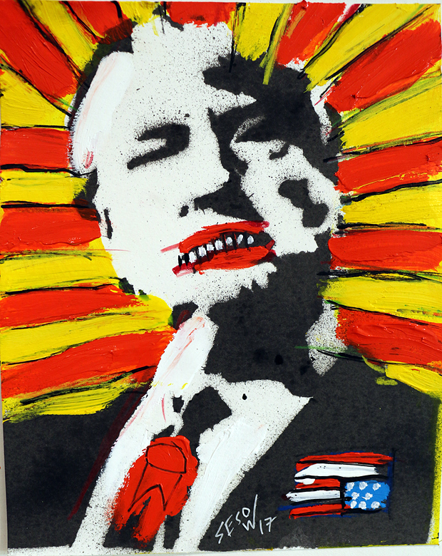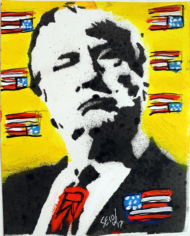 "Dear Leader (1)" spraypaint/acrylic on archival paper 8" x 10" *SOLD email sesow@sesow.com to reserve/ask about purchasing. please include url and description. |
