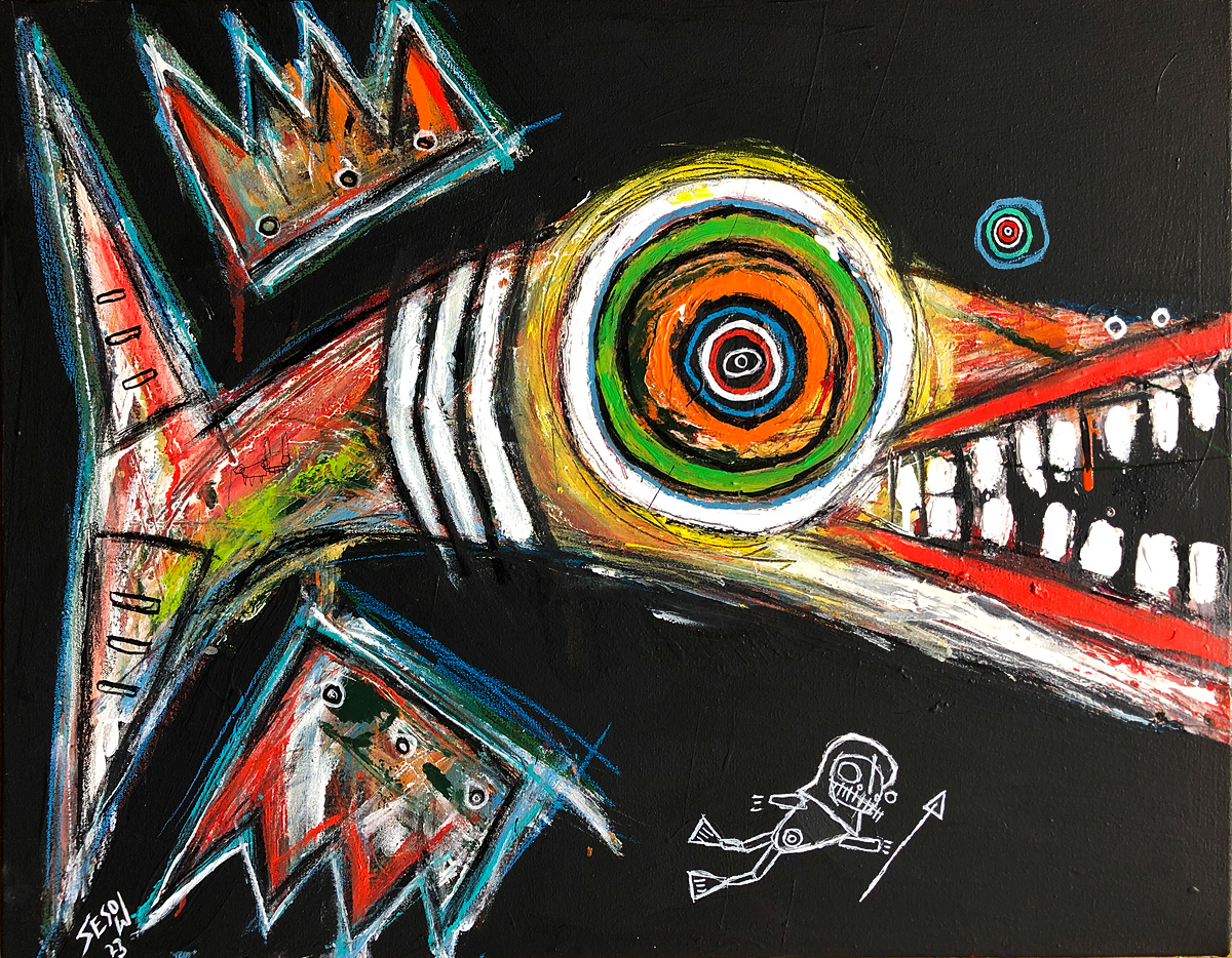 "Big Fish (small pond)" acrylic/oil on stretched canvas 18" x 24" *SOLD email sesow@sesow.com to reserve/ask about purchasing. please include url and description. |