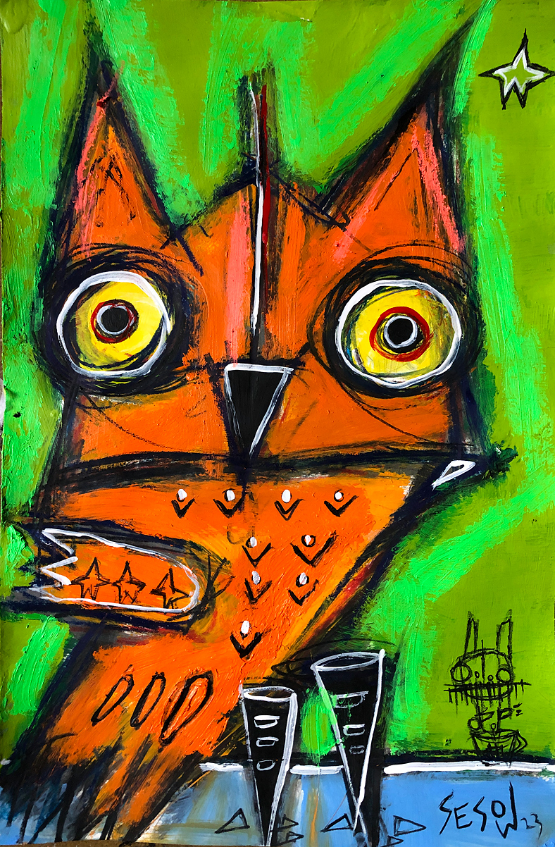 "Orange Owl" acrylic/mix on archival paper 12" x 18" *SOLD email sesow@sesow.com to reserve/ask about purchasing. please include url and description. |