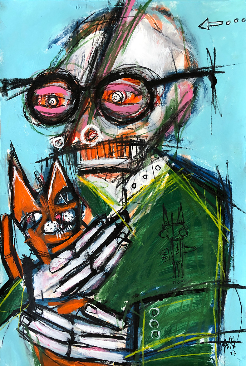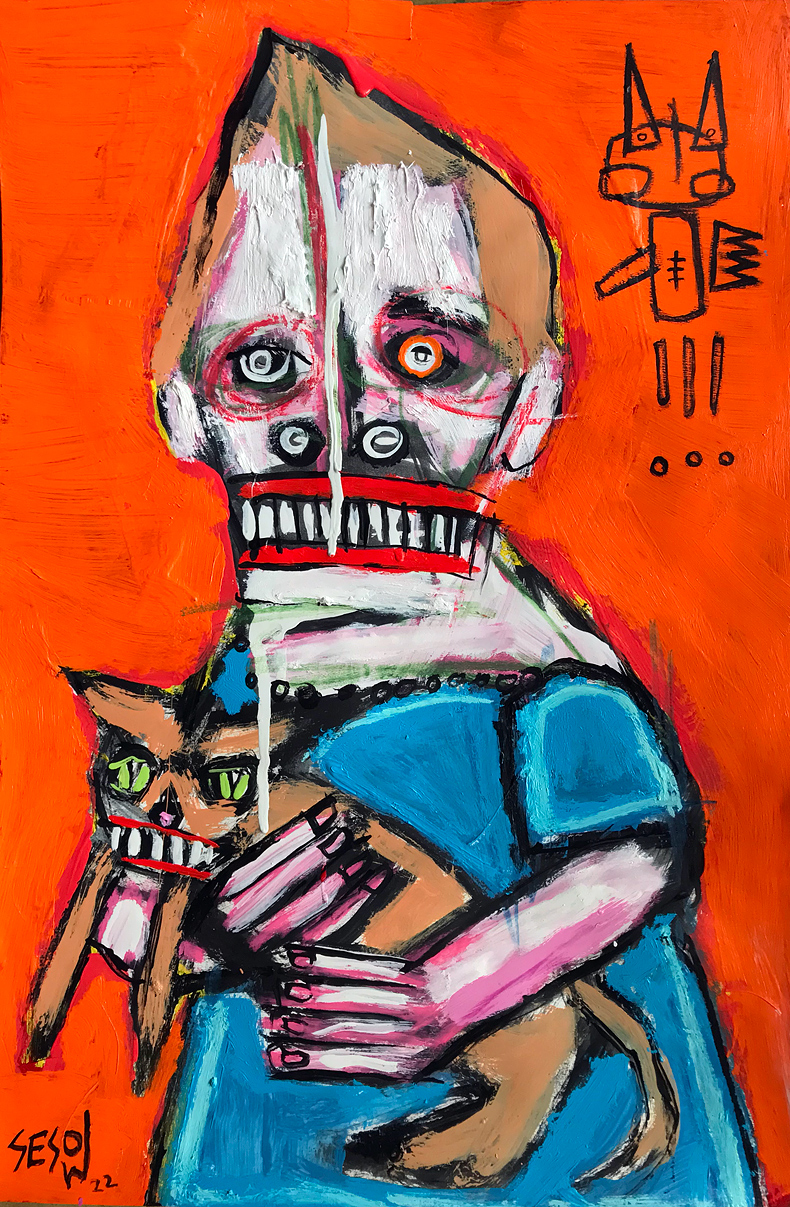 "Proper, with Cat" acrylic/mix on watercolor paper 22" x 15" *SOLD email sesow@sesow.com to reserve/ask about purchasing. please include url and description. |