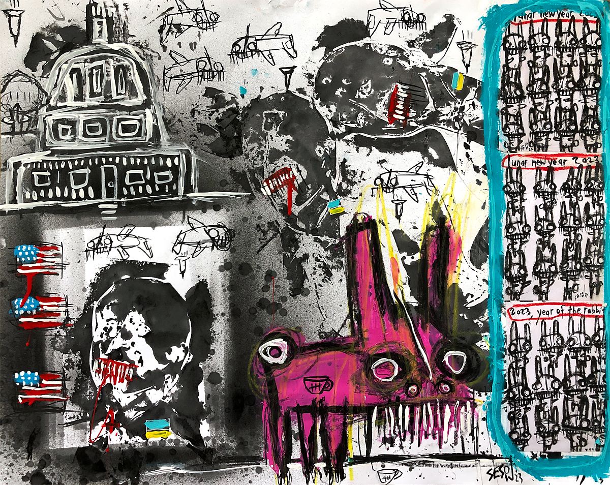 "Year of the Bunny" (mix on paper) 23" x 29" *SOLD acquired paper from Felix Gonzalez-Torres "untitled" national gallery of art DC 2022 "The Double" email sesow@sesow.com to reserve/ask about purchasing. please include url and description. |