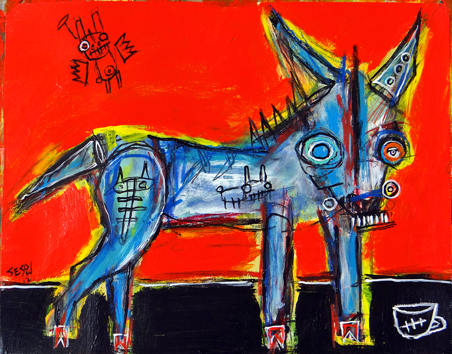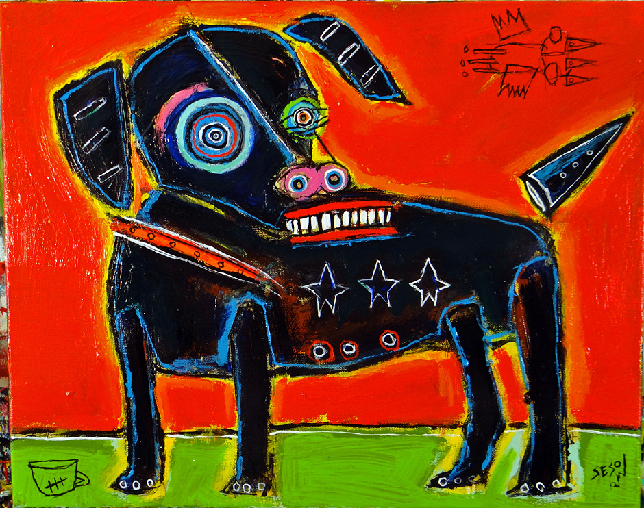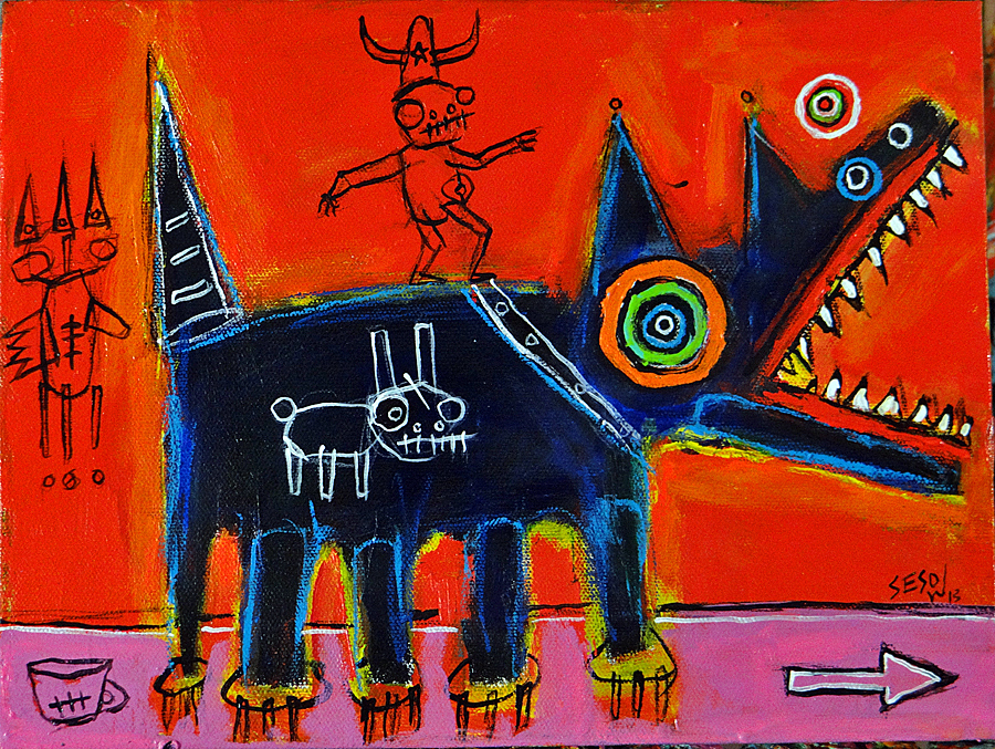 "Sesow Dog (Ride the Tiger)" acrylic/oil on stretched canvas 9" x 12" $140 email sesow@sesow.com to reserve/ask about purchasing. please include url and description. |