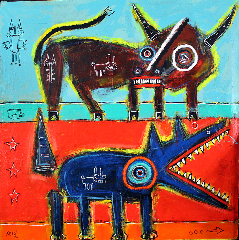 "Bull and Dog" acrylic/oil on unstretched canvas 32" x 32" *SOLD email sesow@sesow.com to reserve/ask about purchasing. please include url and description. |