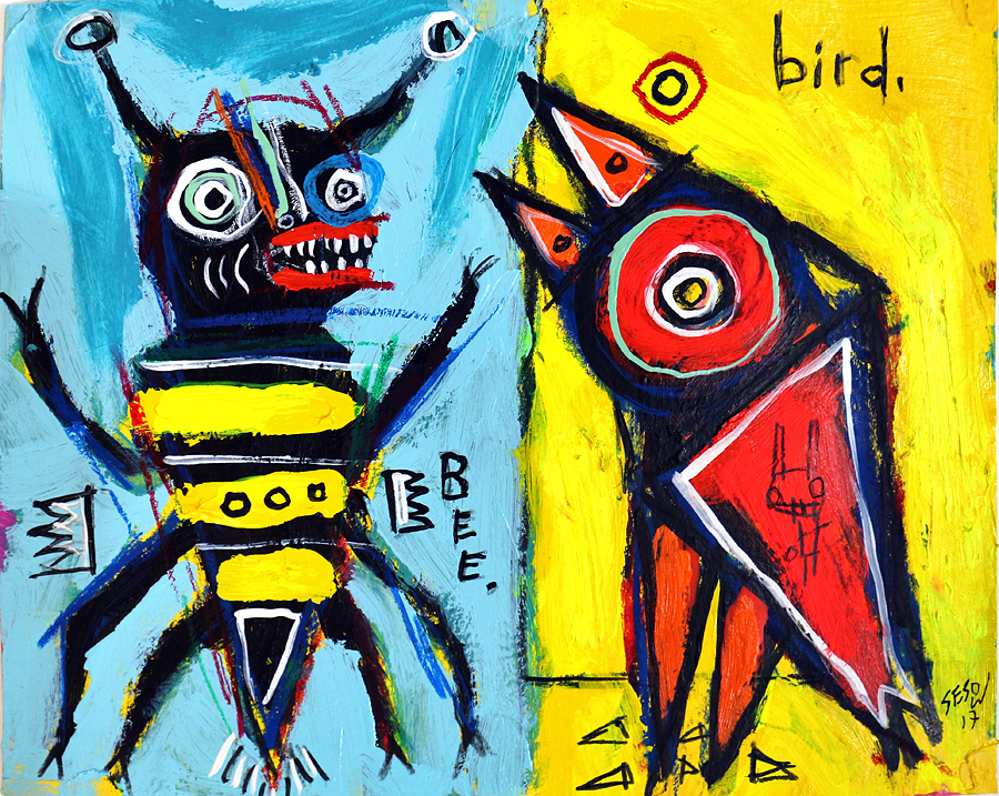 "Bee with Bird" acrylic/mix on archival paper 8" x 10" on hold email sesow@sesow.com to reserve/ask about purchasing. please include url and description. |