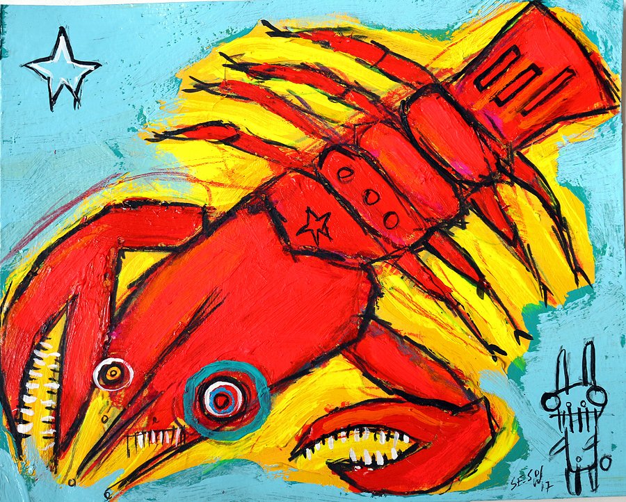"Lobster, with tiny rabbit" acrylic/mix on archival paper 8"x10" *SOLD email sesow@sesow.com to reserve/ask about purchasing. please include url and description. |