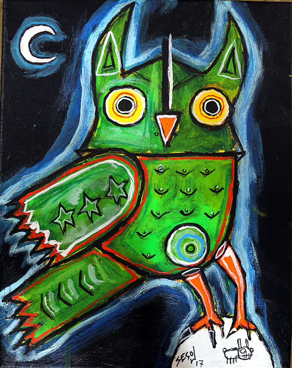 "Green Owl at Night" acrylic/mix on stretched canvas 11" x 14" *SOLD email sesow@sesow.com to reserve/ask about purchasing. please include url and description. |