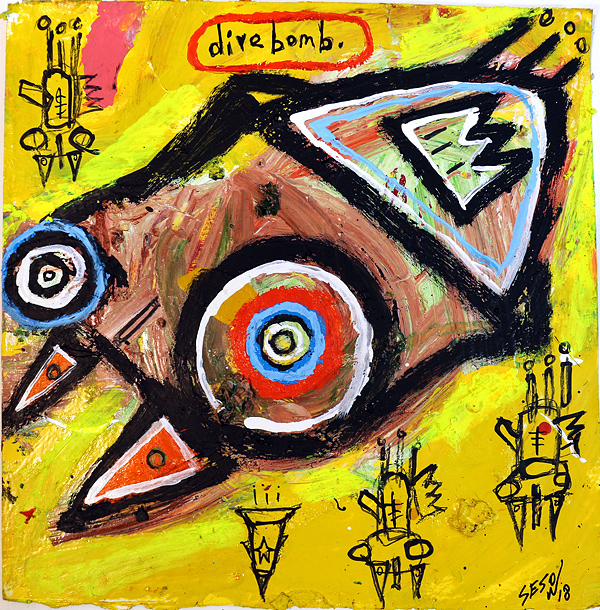 "Dive Bomb" acrylic/mix on archival paper 9" x 9" *SOLD email sesow@sesow.com to reserve/ask about purchasing. please include url and description. |