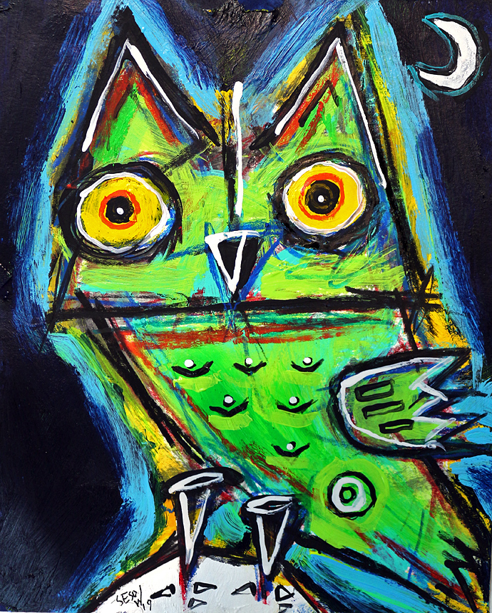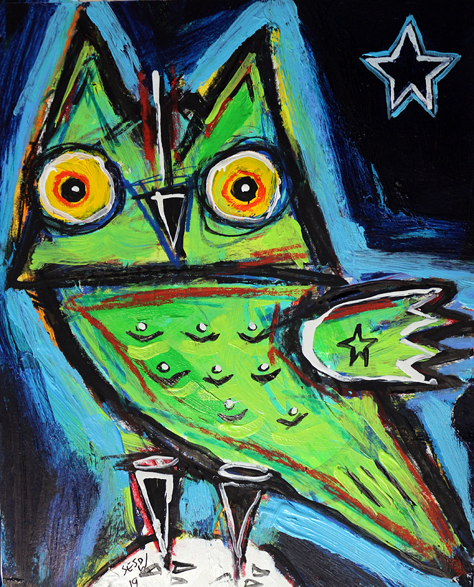 "Green Owl with star" acrylic/mix on archival paper 8" x 10" *SOLD email sesow@sesow.com to reserve/ask about purchasing. please include url and description. |
