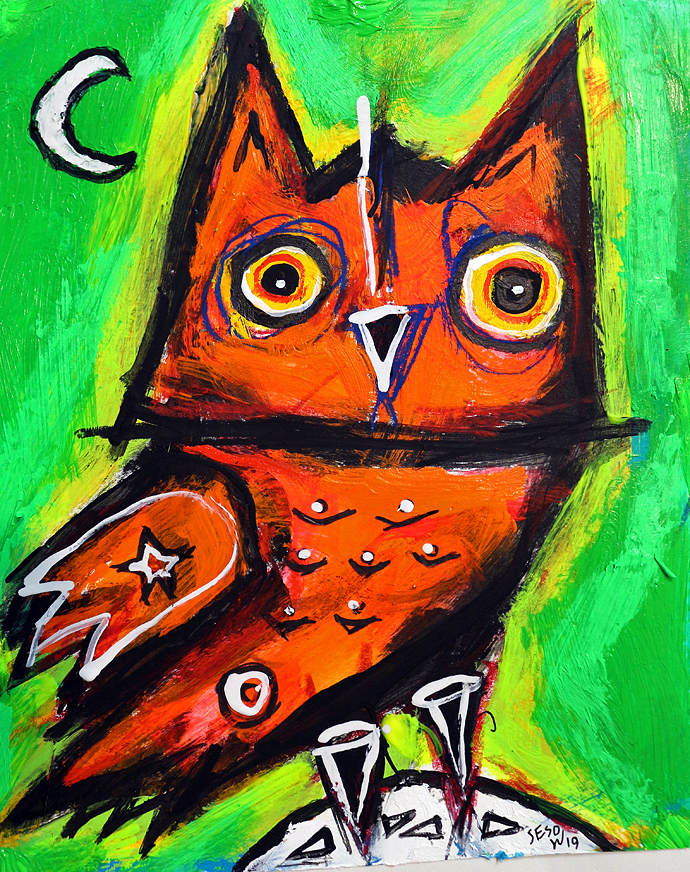 "Owl with Moon" acrylic/mix on archival paper 8" x 10" *SOLD email sesow@sesow.com to reserve/ask about purchasing. please include url and description. |