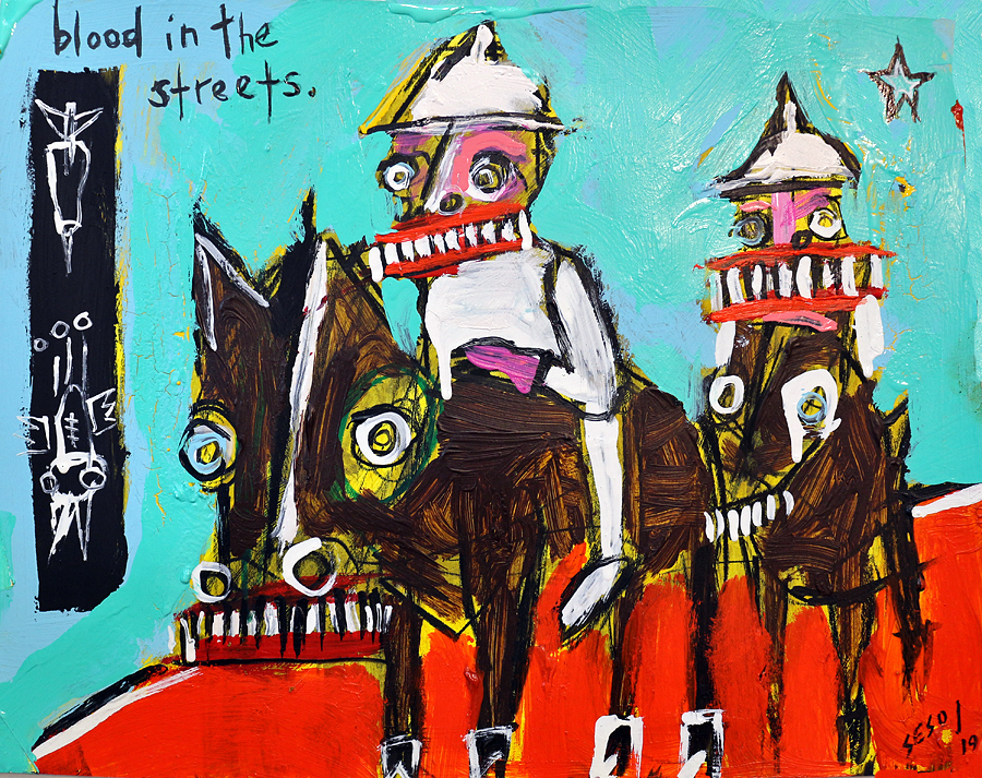 "Blood in the Streets" acrylic/mix on archival paper 11" x 14" *SOLD email sesow@sesow.com to reserve/ask about purchasing. please include url and description. |