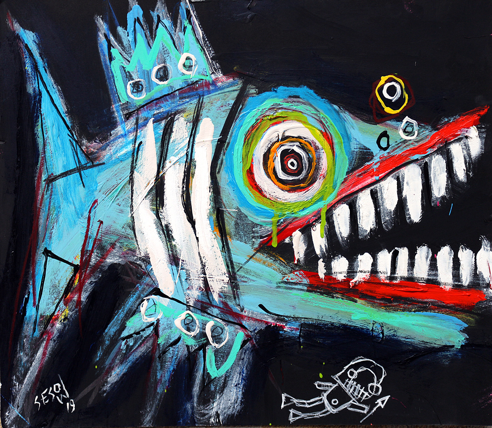 "Flying Fish" acrylic/oil on unstretched canvas approx. 23" x 57" (approx. 1.5" black around the edges *SOLD email sesow@sesow.com to reserve/ask about purchasing. please include url and description. |