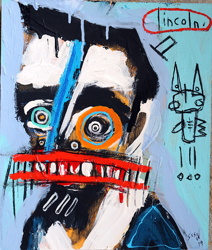 "Little Lincoln (with rising phoenix)" acrylic/mix on matboard approx. 12.75" x 10.75" *SOLD email sesow@sesow.com to reserve/ask about purchasing. please include url and description. |