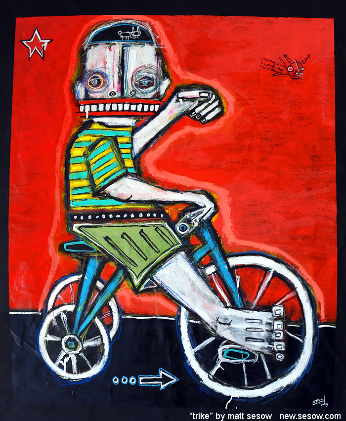"Tike on Trike" acrylic/oil on unstretched canvas 28" x 34" (with approx. additional 2" black border surrounding available mid-July email sesow@sesow.com to reserve/ask about purchasing. please include url and description. |