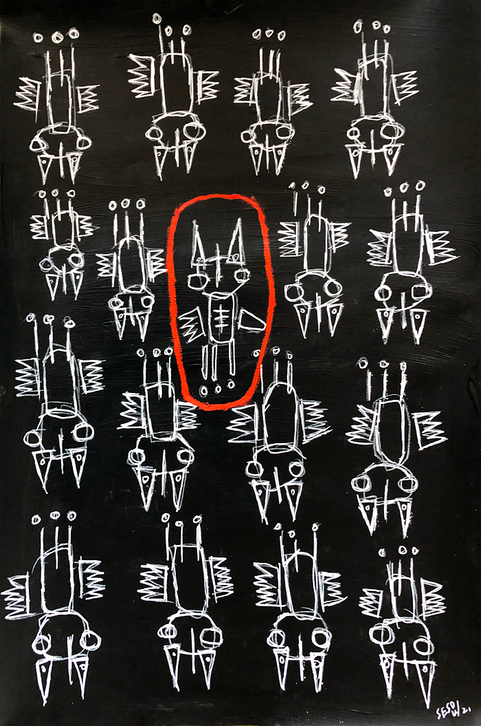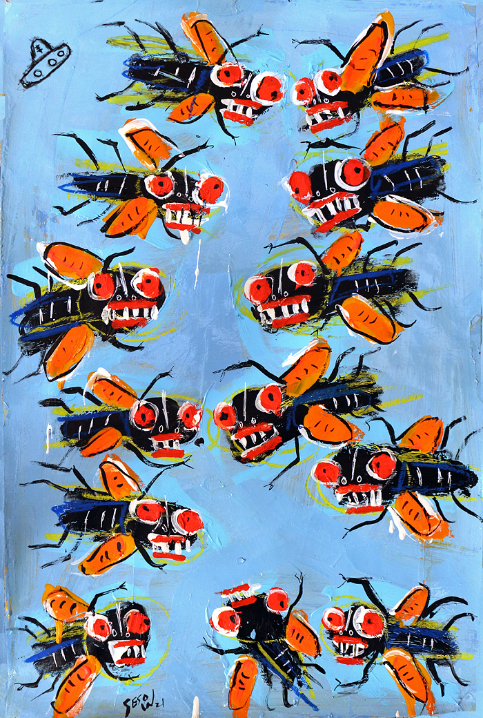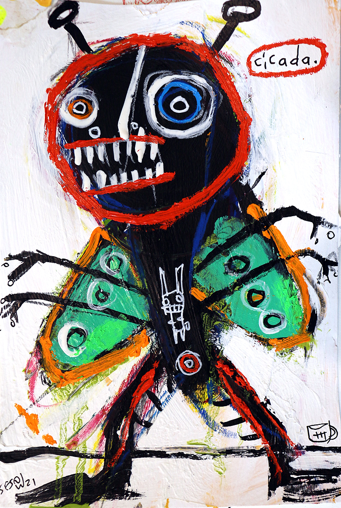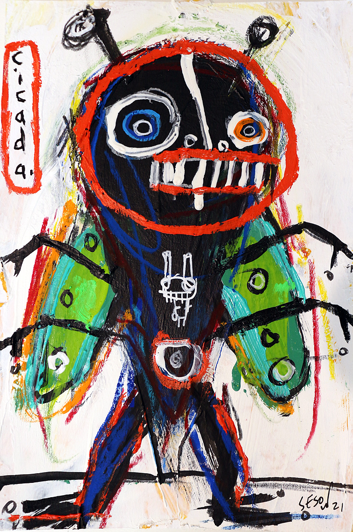 "Brood X Cicadas, with tic tac" acrylic/mix on paper 12" x 18" *SOLD email sesow@sesow.com to reserve/ask about purchasing. please include url and description. |