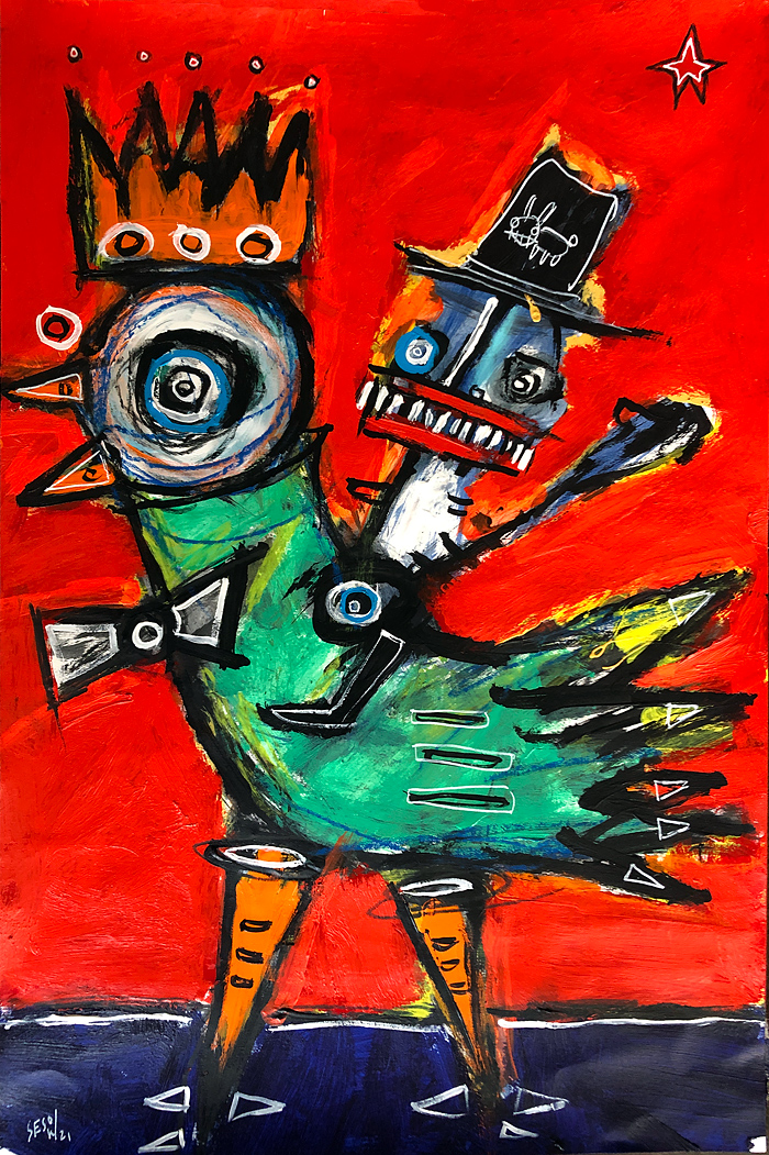 "Chicken Cowboy" acrylic/mix on paper 12" x 18" *SOLD email sesow@sesow.com to reserve/ask about purchasing. please include url and description. |