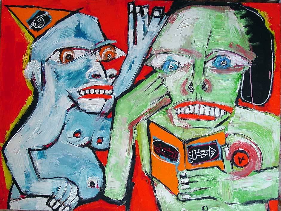 "The Report" 30" x 40" oil/acrylic on chipboard "31 Days in July" 2004 project (July 23) $600 |
